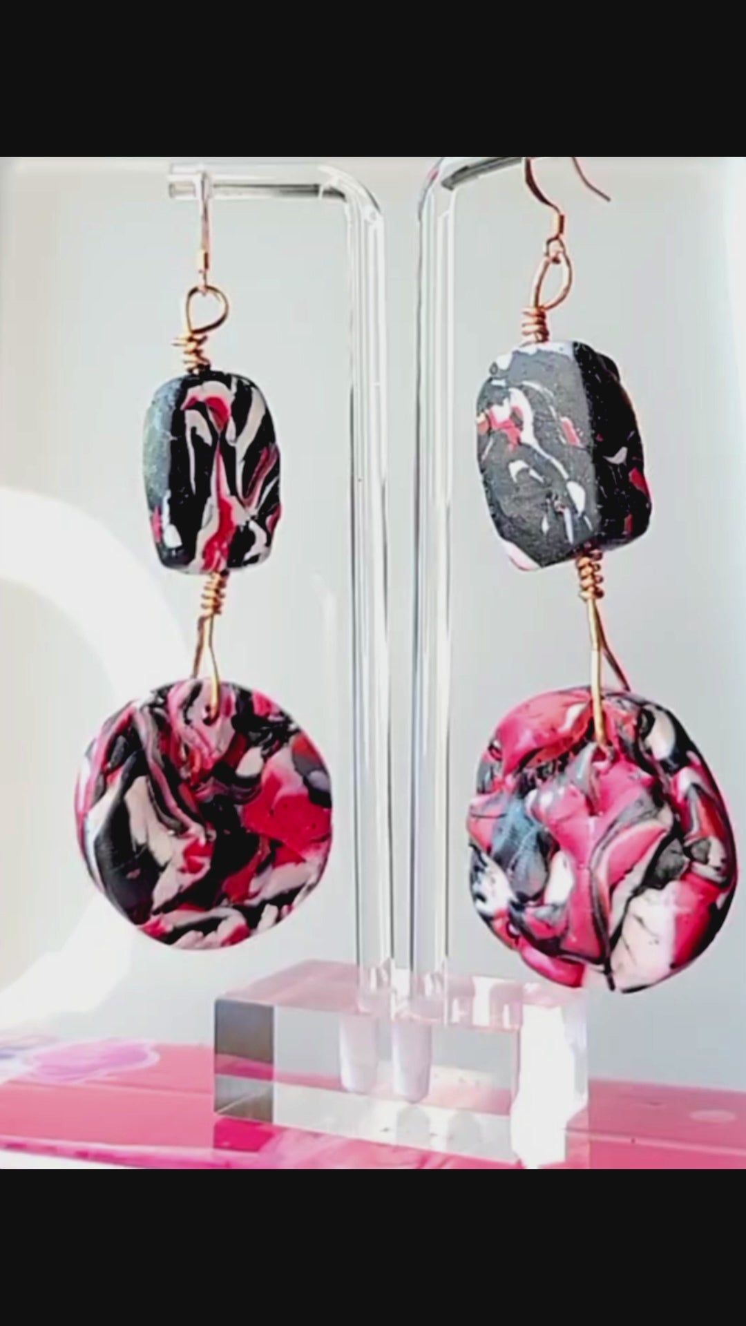 Our Ball's in Your Court earrings are one of many in our Billy's Message Collection. These earrings feature hand crafted polymer clay with swirls of black, red, white, and gray. They are accented by bare copper.