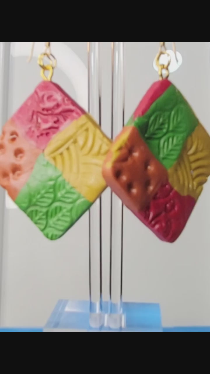 Our Autumn Collection of earrings features the wonderful fall colors of green, orange, tan, red, yellow, and gold. It features handmade textured elements. This is a polymer clay collection accented in gold. We hope you enjoy this collection as much as we do.