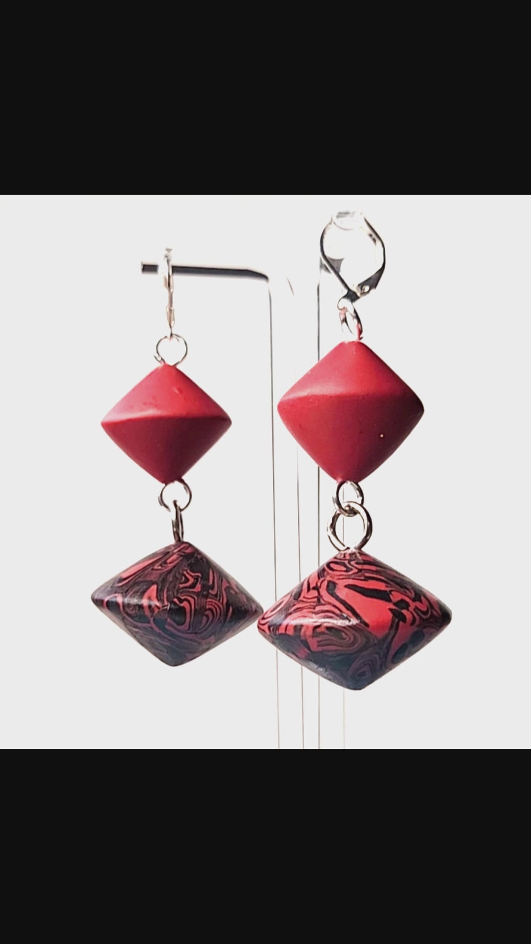 In Orbit features double lentil beads swirled with red and black accented with stainless steel. These earrings are heavy.